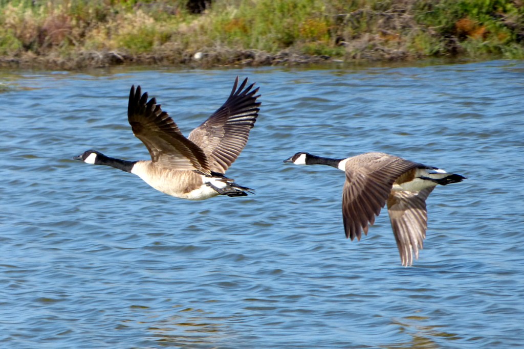 “Birds in flight,” or BIF for short, is a genre of bird photography that is held in high esteem, because it’s hard for both the photographer and the camera. The smaller the bird, the faster they are, and the greater the challenge. Most of the time, I’m just happy to get the birds in frame, much less in focus. An experienced photographer can set up in a place where birds have a high likelihood of flying past, but that requires knowledge of bird behavior and the location. I was photographing birds at a small pond next to the Bay Trail in San Leandro, CA. There were American avocets, black-necked stilts, and these geese. I set up with the sun and wind to my back. The geese became very vociferous, which was as a sign they might take off. It was enough of a heads-up that I was able to line up and fire off a burst of shots. Luckily, a couple of them were sharp, and I chose this one because of the wing positions. Notice the birds are already flying away from me at this point. When I get better, I hope to get photos of birds coming towards me. The shutter speed was 1/1000 of a second, which was not quite fast enough to stop the wingtips from blurring. I was already at ISO 250, so increasing the shutter speed would have forced me to use a high ISO (with more noise). Such are the limitations of shooting with a tiny 1/2.3″ sensor and a fixed lens.