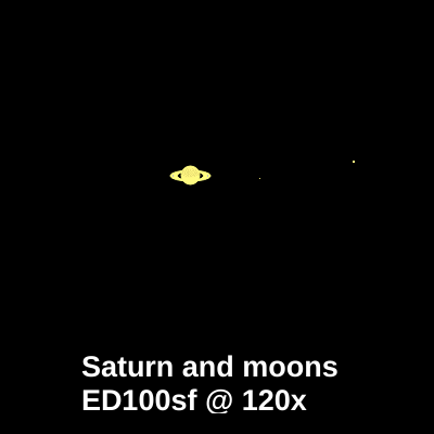I could easily make out two moons, the brightest being Titan. The disk of the planet was bright yellow, with darkening in the northern hemisphere. The Cassini division (gap between the rings) was hinted at in the ansae (protrusion of the rings). I just read that up to 6 moons can be seen through a telescope, but I only recall seeing two.