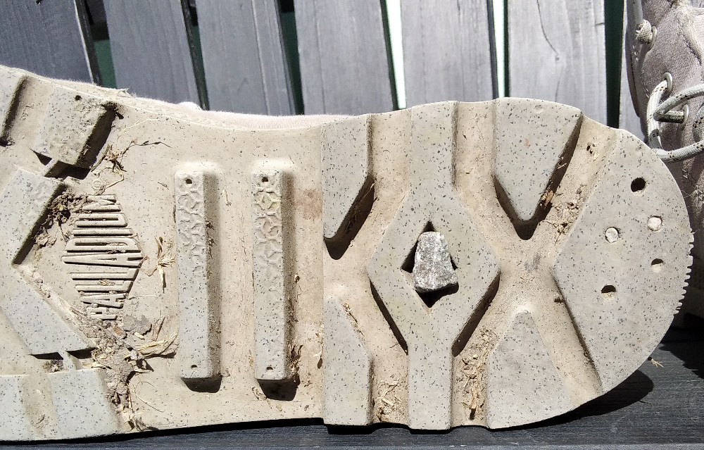 One negative is the sole design tends to trap pebbles between the lugs. It happens on virtually every outing. I have become adept at dislodging these rocks by rubbing my foot on other objects. The grip on slippery surfaces is also not the best, just passable.